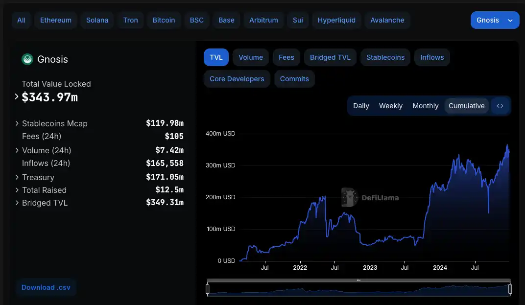 Gnosis Chain,这是上一轮周期里比较出名的以太坊侧链,专注于高效、安全的去中心化应用构建。根据 DefiLlama 数据,截至撰写本文时,Gnosis Chain 的锁仓总价值(TVL)为 $349.31M,其中包括 $71.61M 的原生资产和 $277.7M 的跨链桥接资产。稳定币市值达 $119.98M,其中 DAI 占比 74.07%,交易量保持稳定。