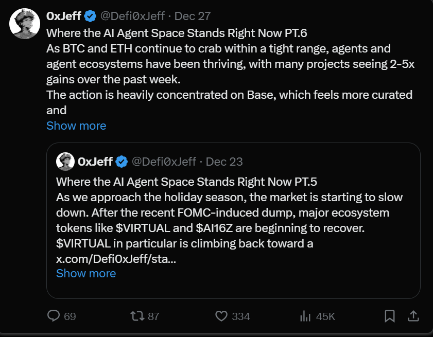 我在我的文章、帖子和推文中概述了这些叙事中的项目和玩法。如果你一直关注,可能已经看到其中一些项目实现了 5 倍到 20 倍的回报,这是你积累代际财富的机会。或者你也可以在假期里放松,看着机会消失。选择权在你。建议从以下几篇文章开始,它们对 AI 代理领域进行了全面的回顾: