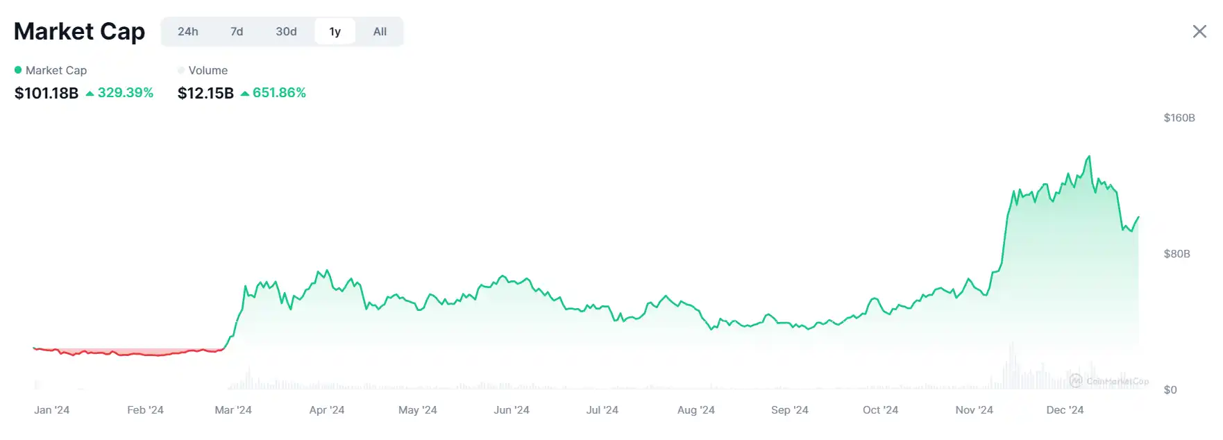 meme 币 2024 年总市值变化;图源:CoinMarketCap