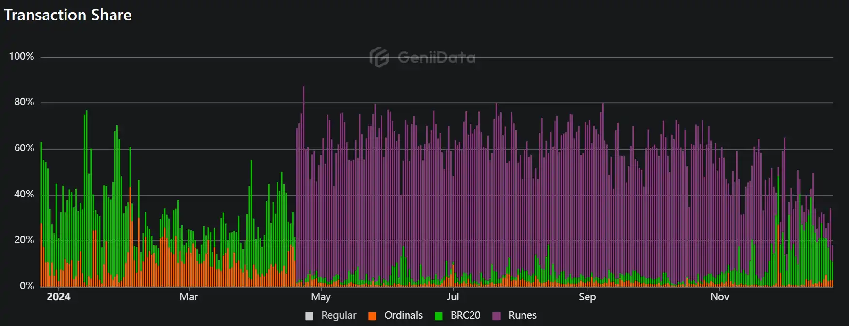 比特币链上交易份额;图源:geniidata