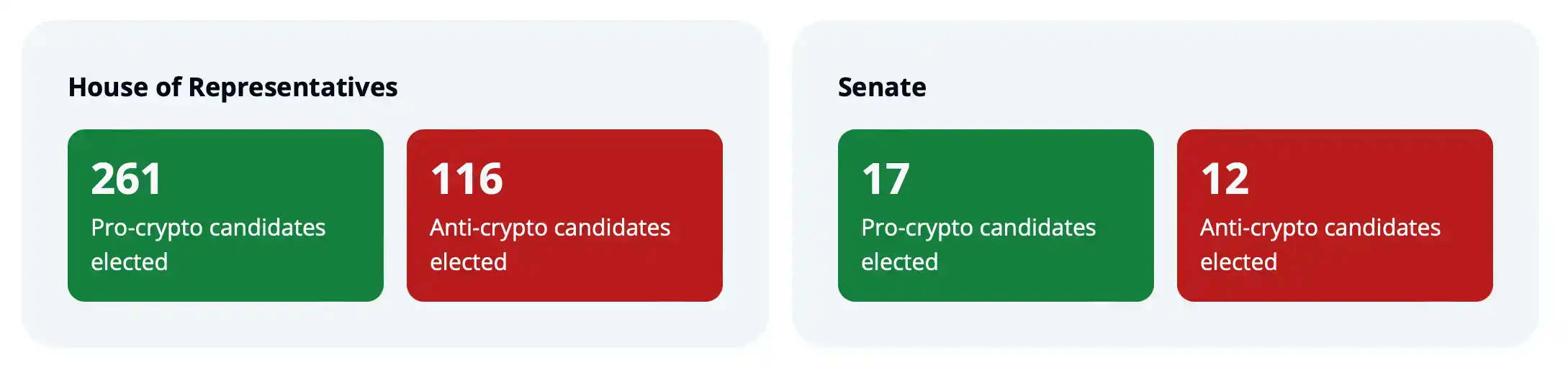 根据 Stand With Crypto 数据统计,在本次大选中,共有 261 名支持加密货币的候选人赢得了众议院席位,而反对加密货币的众议员则只有 116 名。同时,新一届参议院也更加偏向支持加密货币,有 17 位支持者,反对者为 12 位。