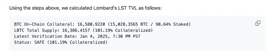 为了展示该方法在实践中的应用,我们使用开源工具 Proof of TVL 对 Lombard Finance 进行了验证。