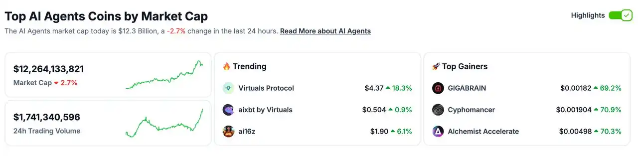 AI Agent 赛道持续保持市场热点地位,市场规模已达 122 亿美元,周环比增长近 12%。市场关注度从 AI Meme 逐渐转向 AI 基础设施建设项目,其中 AI Agent 自主发币成为最受关注的领域,相关基础设施项目如 Phala Network 等表现突出。
