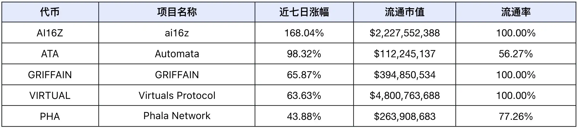 可以从涨幅榜看出本周涨幅榜所有的项目均与 AI Agent 赛道有关。