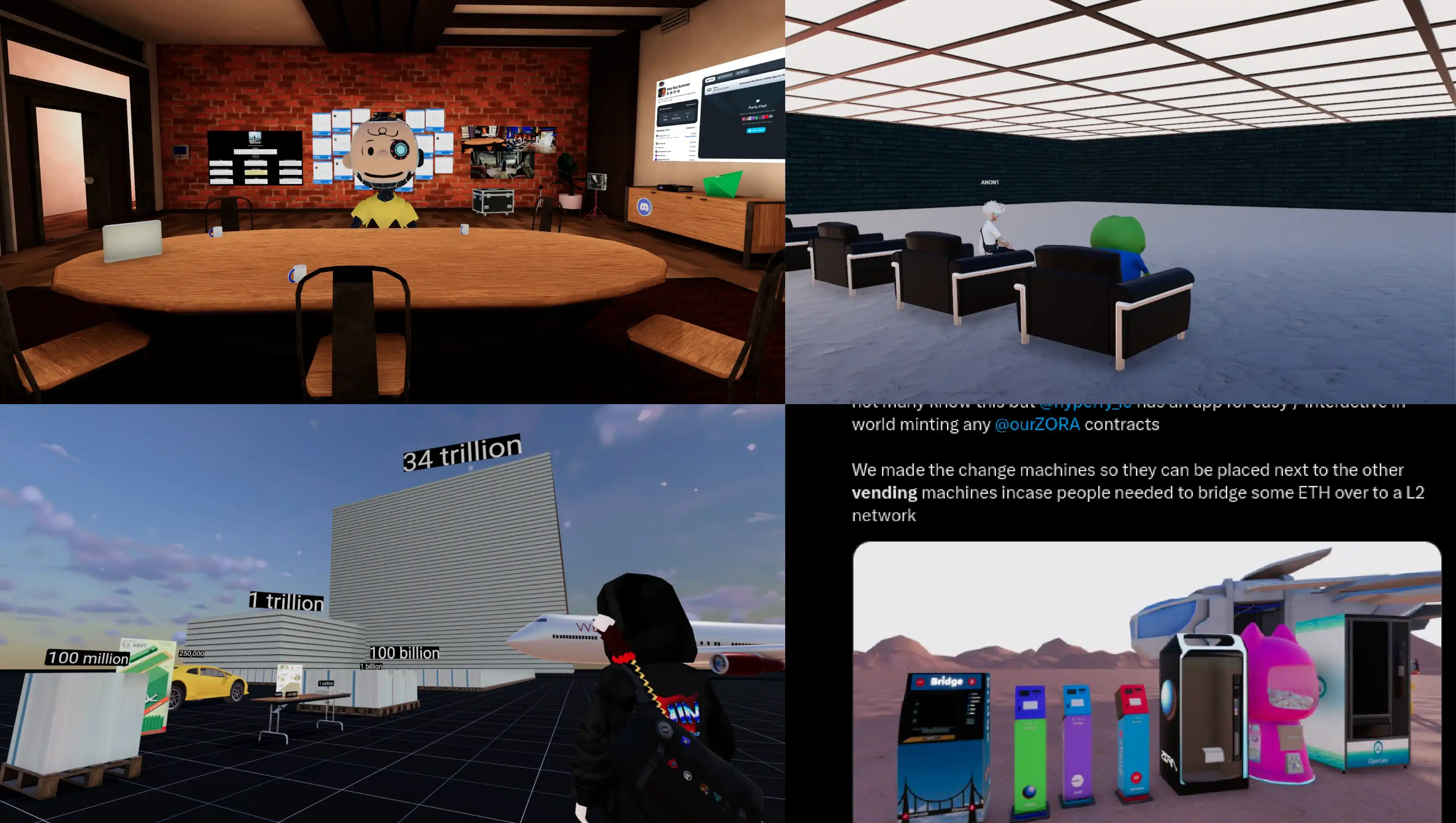 更多场景:pmairca「parody Marc」的会议室、AI 做 评委的游戏节目世界、3D 数据可视化「ai16z 国库钱包可视化」、加密货币自动售货机。