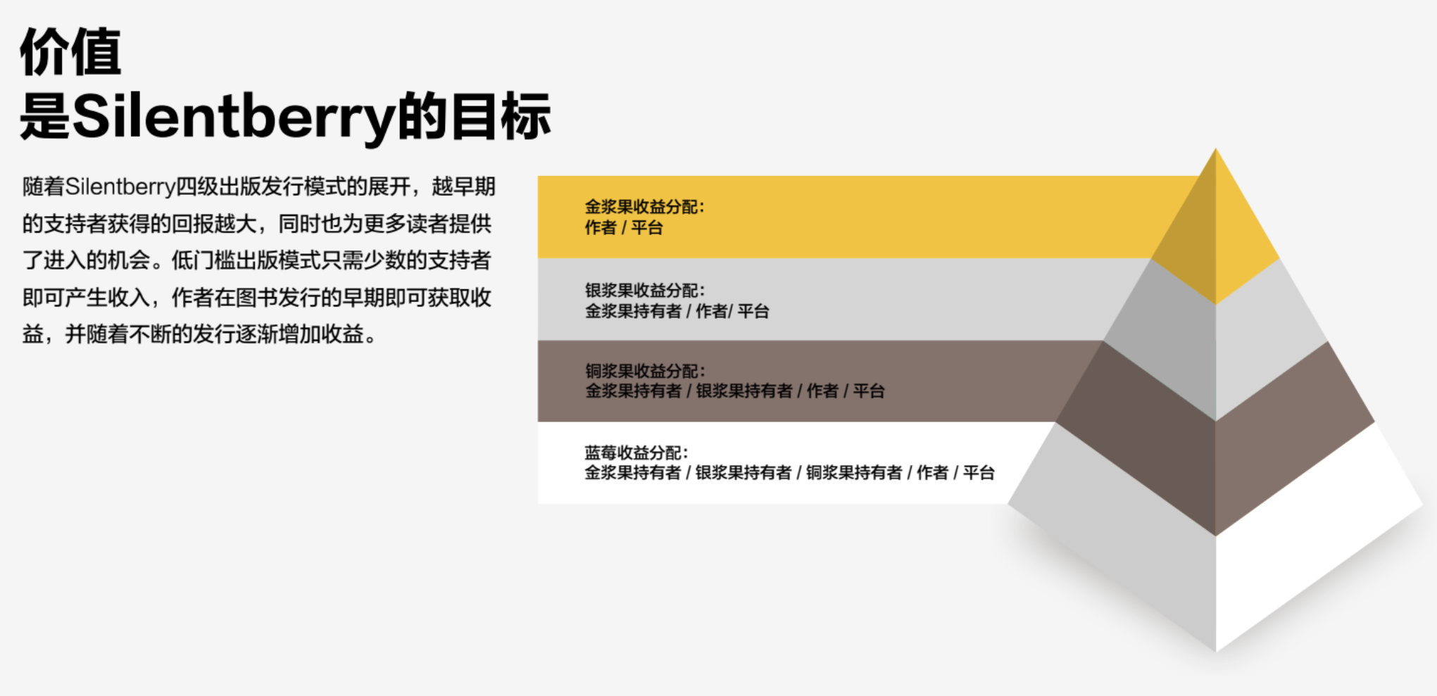 SilentBerry 通过创新的四级发行模式,为支持者和创作者之间建立了更加公平的收益分配体系,同时降低了出版的门槛,扩大了读者参与的机会。创作者可以在图书发行的早期阶段便获得收入,而随着发行的逐步推进,收益也会持续增加。