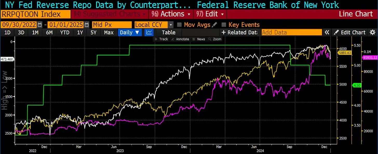 逆回购工具(RRP)已几乎降至零,为了彻底耗尽该工具的资金,美联储迟迟调整了 RRP 的政策利率。在 2024 年 12 月 18 日的会议上,美联储将 RRP 利率下调了 0.30%,比政策利率的降幅多出 0.05%。此举旨在将 RRP 利率与联邦基金利率(FFR)的下限挂钩。