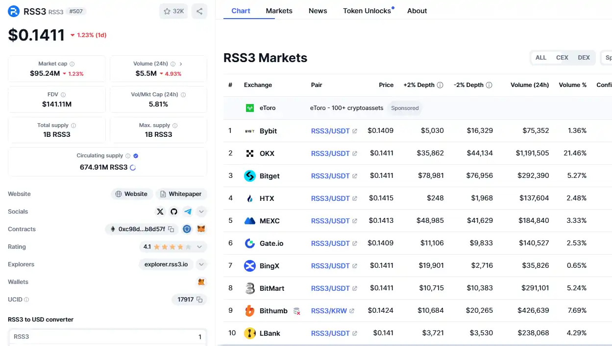 根据 coinmarketcap 的代币信息,RSS3 目前已经上线了 OKX,Bybit,Bitget,HTX,MEXC,Gate 以及韩国交易平台 Bithumb 等交易平台!并传言或将上线 coinbase 交易平台!