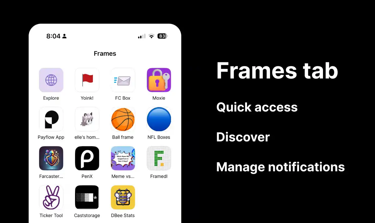 在这种背景下 Farcaster 团队推出了 Frames v2,拥有基于 HTML/CSS/Javascript 的全屏交互式画布,以实现更为丰富的客户端内部的应用交互,支持应用请求链上交易和签名,以及在客户端向用户发送通知。除了能够在 Feed 中直接打开,Warpcast 也为 Frames 提供了底部中间菜单非常便捷入口。