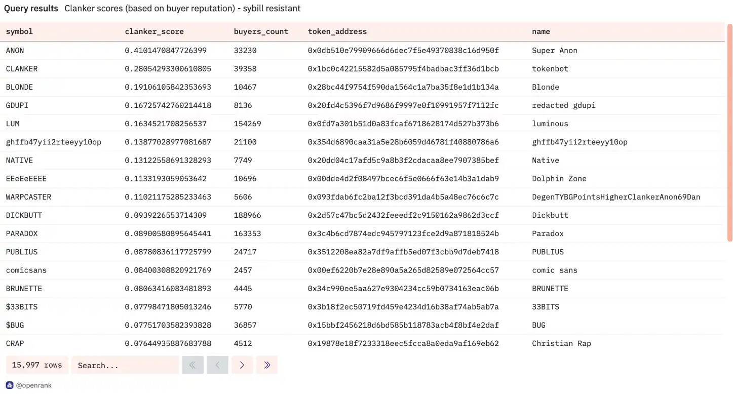 Clanker Tokens ranked by Clanker Scores https://dune.com/queries/4355256/7310627