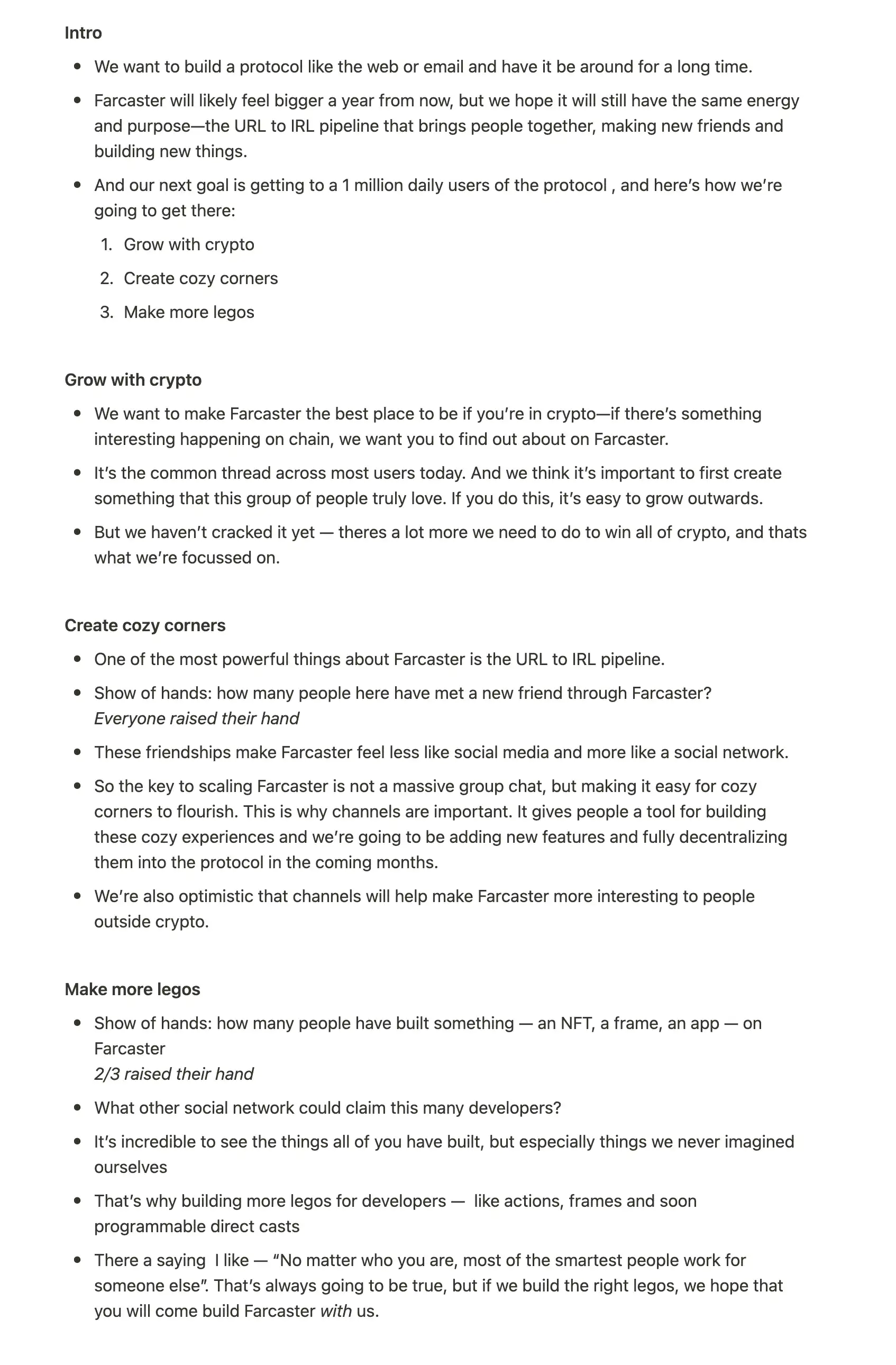 团队在 FarCon 上阐述过 Farcaster 的大致策略是与加密世界共同成长、创造更多的舒适角落以及打造更多的社交乐高。事实上,团队一直有在积极与社区对话,响应社区的意见持续改进或推出一些新的功能,致力于依照既定策略前进以提升日活。