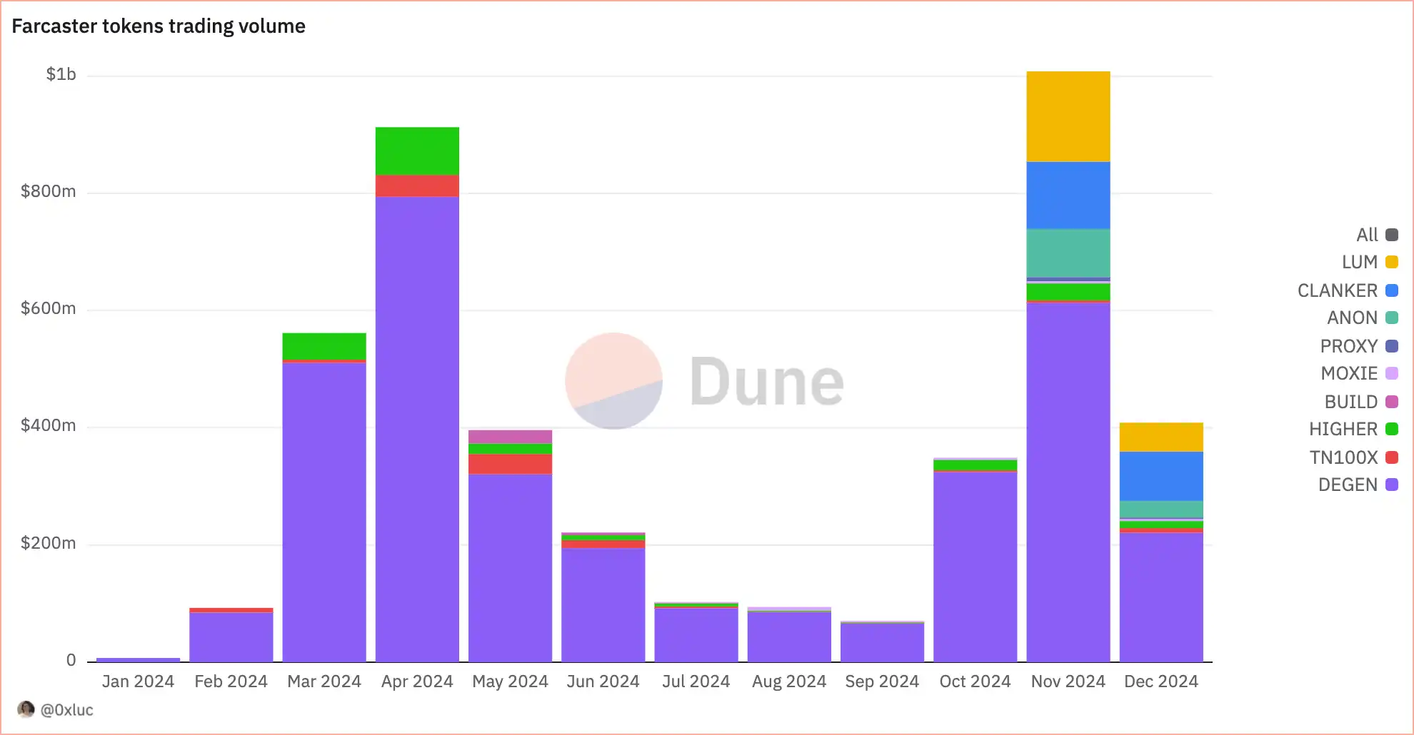 而获得这样巨大的增长很重要一个原因就是 Farcaster 作为加密原生社交网络已经是一些公链(特别是 Base 链)重要的 Social Layer,也可以被视作一个经济体,AKA Farconomy。从 Farcaster 社区诞生的项目的、或者通过 Farcaster 上的 Launchpad 发行的资产获得了一定的市场注意力,与 Farcaster 有关的主流代币的交易量在 4 月份和 11 月份都达到了 10 亿美元左右,其中占大头的是年初诞生的 $DEGEN 与年末的 CLANKER 生态代币。