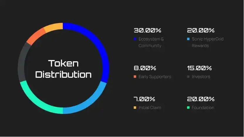 同时,Sonic SVM 公布其原生代币 $SONIC 代币经济学,SONIC 总供应量为 24 亿枚,其中 57% 分配给社区,包含社区与生态发展(30%)、初始认领(7%)和 HyperGrid 奖励(20%)。