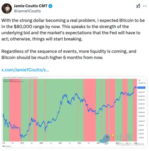 Real Vision 首席加密分析师 Jamie Coutts 在 X 平台发表评论称:「随着美元走强成为一个实际问题,我原本预期比特币现在会在 8 万美元左右,但它没跌到这个程度,这说明了潜在买盘的强劲,以及市场预期美联储将不得不采取行动;否则情况会开始恶化。无论事件如何发展,更多的流动性即将到来,比特币在 6 个月后应该会高得多。」