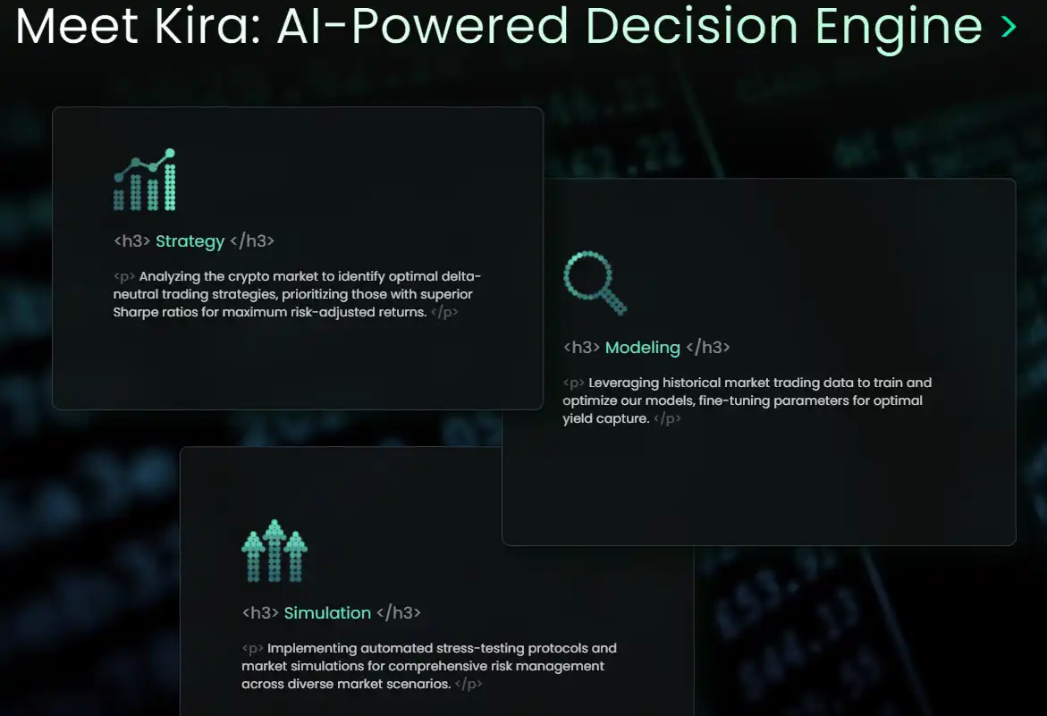 Kira 是对冲基金经理的 AI 代理。分析市场、预测趋势并优化策略。Kira 利用历史市场交易数据来训练和优化模型,可以分析加密货币市场以确定最佳的 delta 中性交易策略,优先考虑高夏普比率的策略,以实现最大回报。实施自动化压力测试协议和市场模拟,以便在不同的市场情景中实现全面的风险管理。