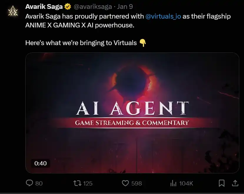 virtuals io 宣布与 avariksaga 达成合作,使 agent 能够实时直播游戏、评论并进行旁白解说。