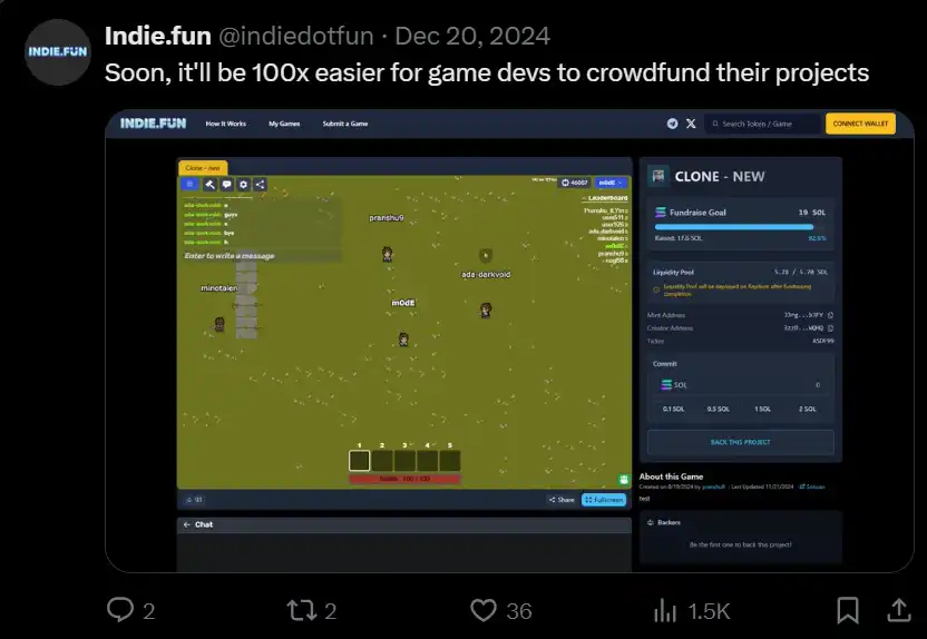 该团队计划在大约一周后推出 indiedotfun。Indiedotfun 类似于 pumpdotfun,但专为游戏设计,允许任何人通过模板和 moddio 的游戏/物理引擎快速构建自己的世界。然后,这些世界可以被代币化,使用户和社区能够拥有他们喜爱的游戏。