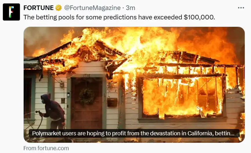 编者按:文章批评了预测市场平台 Polymarket 因用户对加州野火进行投机而引发的争议。在野火已造成多人死亡、数十万人撤离的背景下,用户冷漠押注灾情发展,部分预测资金池高达 10 万美元。这种将公共灾难「博彩化」的行为引发了强烈的道德质疑。