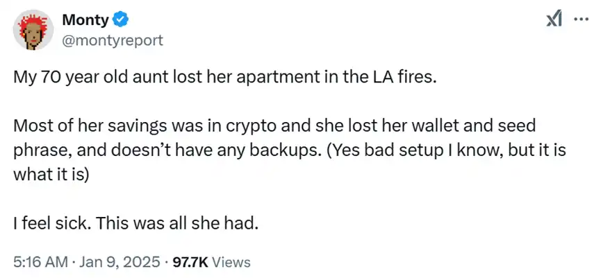 除了威胁数百万加州居民外,迅速蔓延的野火也对多家加密公司和知名社区成员构成了严重威胁。已经有不少人失去了房屋和财物,包括宝贵的硬件钱包。