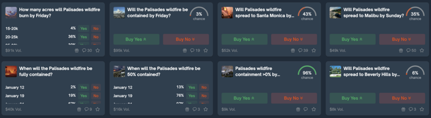 不少 Polymarket 用户借机创建了多个关于火势蔓延、火灾何时得到控制以及潜在政治人物辞职等各类预测市场。一些市场的交易量已接近 10 万美元。