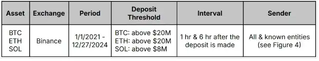 我们的分析重点是 2021 年 1 月 1 日至 2024 年 12 月 27 日期间三种主要加密资产——BTC、ETH 和 SOL——及其在币安的 USDT 价格。选择此时间范围是为了与币安当前用于汇总存款的钱包地址的运营持续时间保持一致。