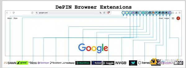 在 2024 年,由推荐计划和积分 / 空投计划驱动的浏览器扩展是 DePIN 节点增长的最大渠道,有 15 个以上的项目推出了浏览器扩展。