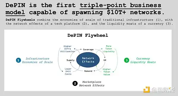 DePIN 飞轮结合了传统基础设施的规模经济(1)、技术平台的网络效应(2)和货币的流动性护城河(3)。