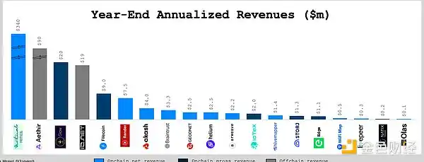 有链上收入的 DePIN 项目的估值中位数是净年度经常性收入(ARR)的 200 倍以上,而有链下收入的项目估值倍数则低于 20 倍。