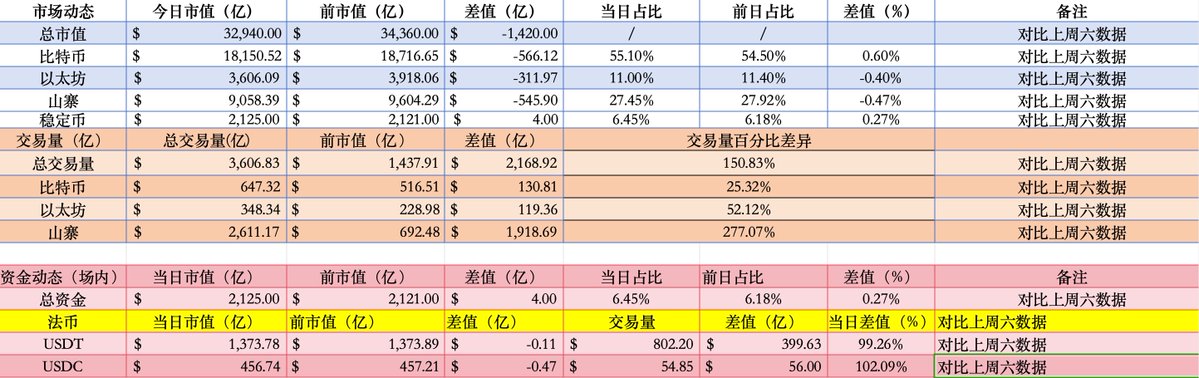USDT: 官网数据 1374.49 亿,对比上周六增加 0.03 亿,虽然市场大幅度下跌,但是亚欧市场资金居然暂停净流出,算是一个小的好数据,同时 USDT 资金活跃度增加 1 倍,应该是大面积清算导致交易量激增。