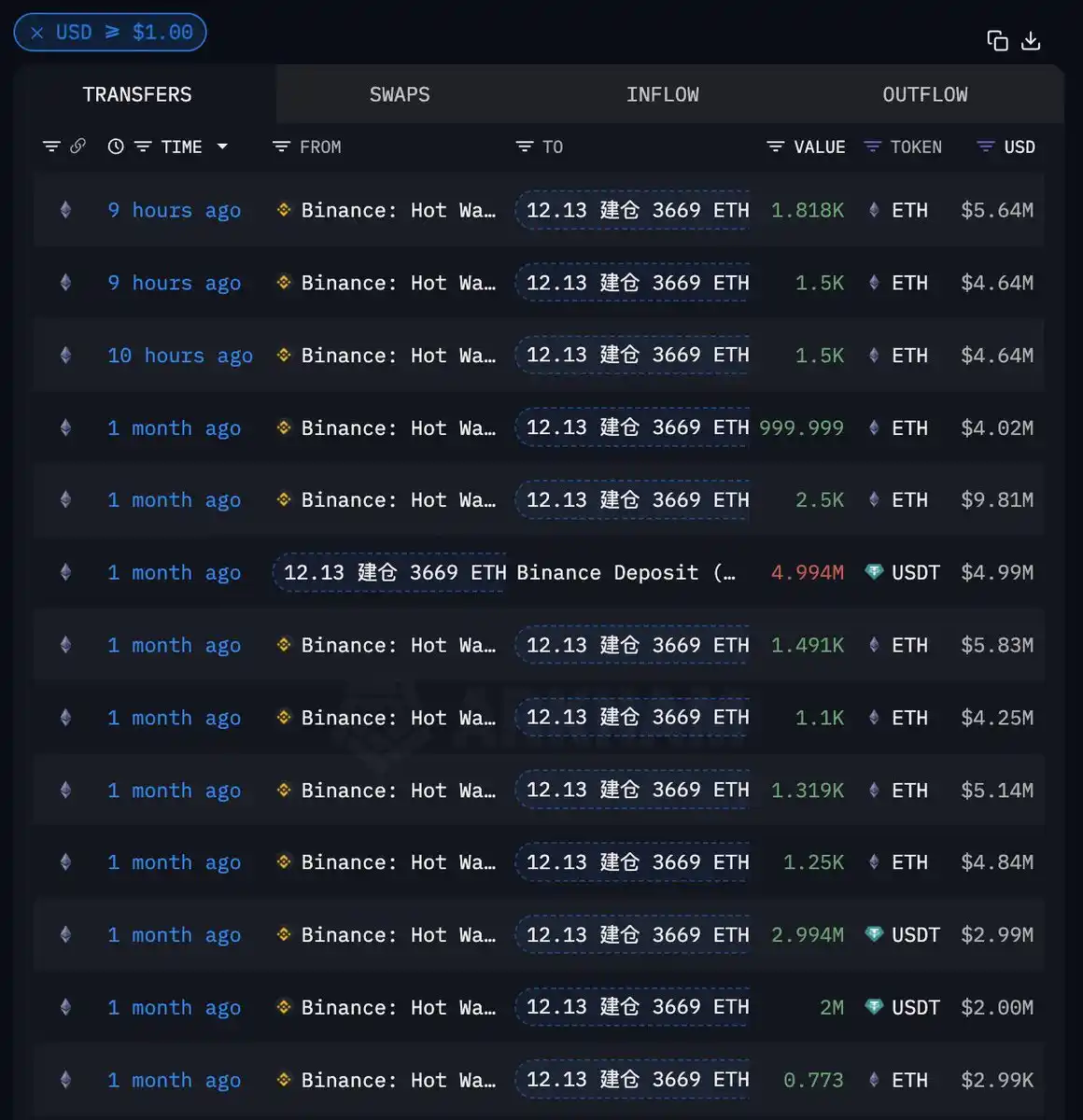 「低买高卖 $ETH 获利 3367 万美金的巨鲸」1 月 13 日从 Binance 提出 10000 枚 ETH,价值 3076 万美金,成本约 $3075.57;目前他共持有 55,166.12 ETH,价值高达 1.69 亿美金