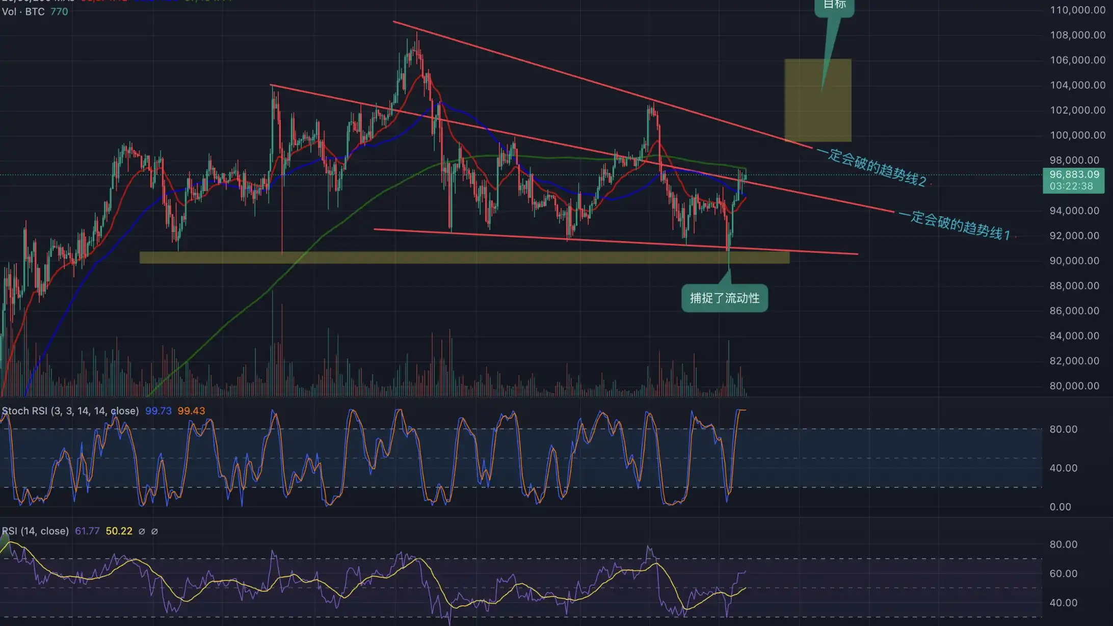 BTC 突破了第一条趋势线,期待突破第二条。短期在等均线跟上价格,休息一下继续涨。