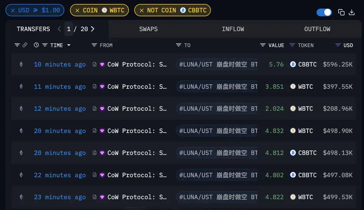 LUNA/UST 崩盘时做空 $BTC 赚取 516 万美元的聪明钱以均价 $103,872 买入 31.17 枚 WBTC 和 cbWBTC,价值 319 万美金,不确定是否会继续加仓;