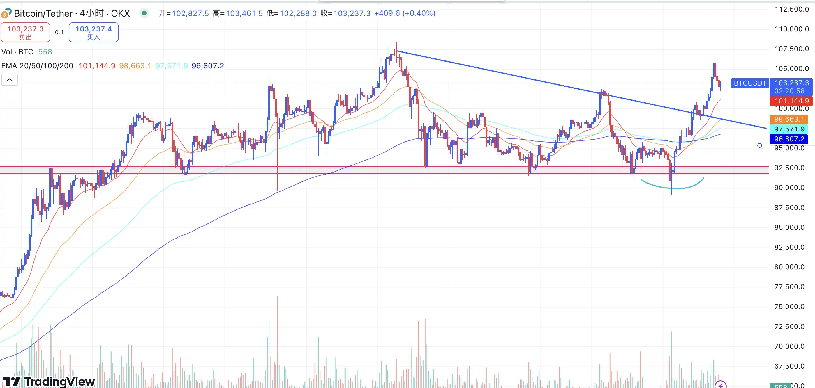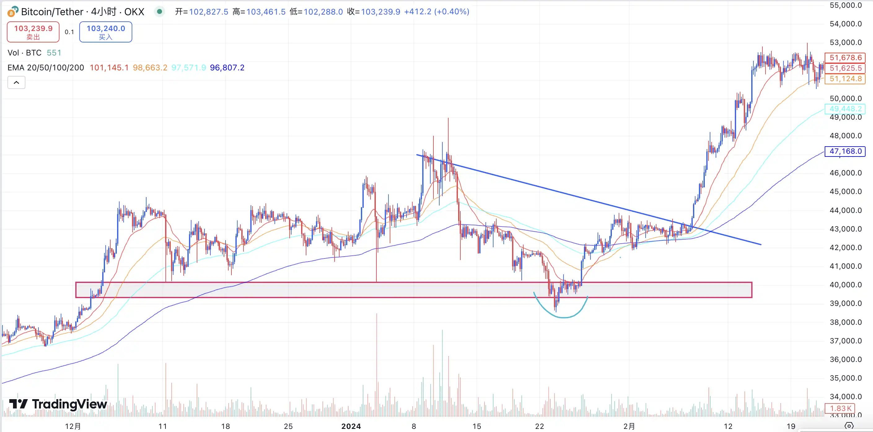 如果从技术图表的层面来解读的话,BTC 已经突破了下行趋势线,在前流动性密集区域得到了强力的支撑,可以理解为一个底部的「黄金坑」,形成 V 形反转,也打破了更低的高点,更低的低点的下跌结构,形成了更高的高点,更高的低点的上行结构,根据很多人认可的将 4 小时 EMA200 作为「牛熊分界线」的角度来说,BTC 现在的价格仍然处于 4 小时级别的 EMA200 之上,可以视作 BTC 的牛市尚未结束。