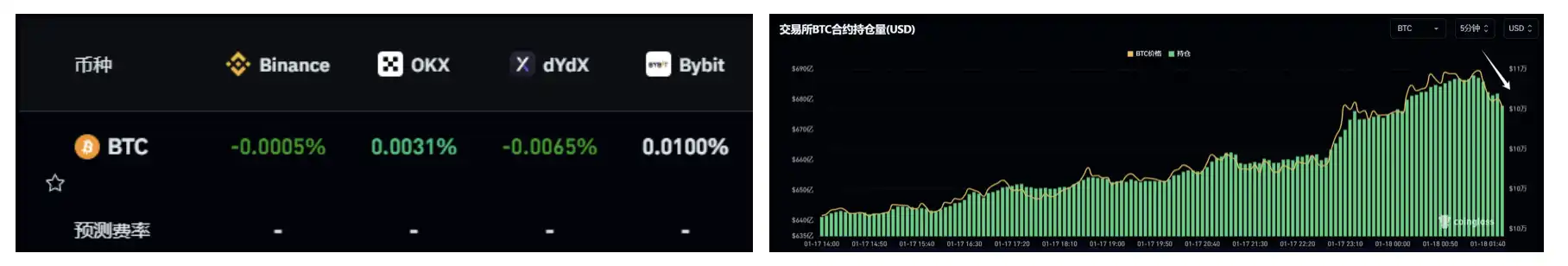 再从期货持仓量的角度来看,持仓陡然下降,资金费率快速降低至负值,这波行情的期货多头刚才出现了一定规模的平仓,空头对价格进行了追逐,有意思的是,资金费率变负往往是见底的标志。想必 Trump 正式上任之时,必是一场腥风血雨的多空绞肉机。