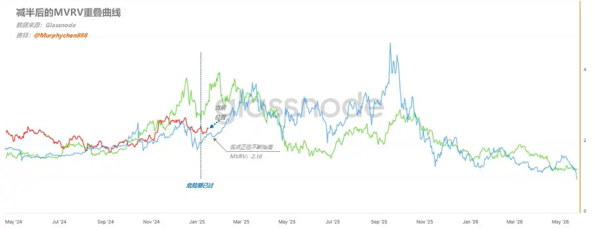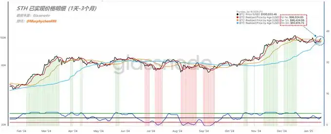 从上图上看,目前我们已经度过了「危险期」,而且蓝线的低点正在不断抬高。也就是说,从当前位置红线即便再次回调,最低点已经上升到 MVRV 2.16 的位置了,对应到对应到 BTC 的价格是$90,000 左右。同样,也是未必定会到;就短期来看,当 CPI 数据出来以后 BTC 再次站上 10w 以上的这一波反弹的势能,要大于 1 月 6 日那次反弹到$102,000 的势能表现。当价格更低但「NRPL(已实现净盈/亏)」却更高,说明通过这段时间反复盘整,已基本将高位筹码在低位完成了换手,并降低了活跃筹码的平均成本。因此,在反弹中市场可以创造更多的净利润。从这个角度上讲,短期之内 BTC 有具备继续向上的条件,而且这个可能性很大。当我们把短期持有者进行细分,即从 1d-1w、1w-1m 和 1m-3m 的三个不同群体看来看,他们的筹码平均持仓成本已经开始粘合在一起了。