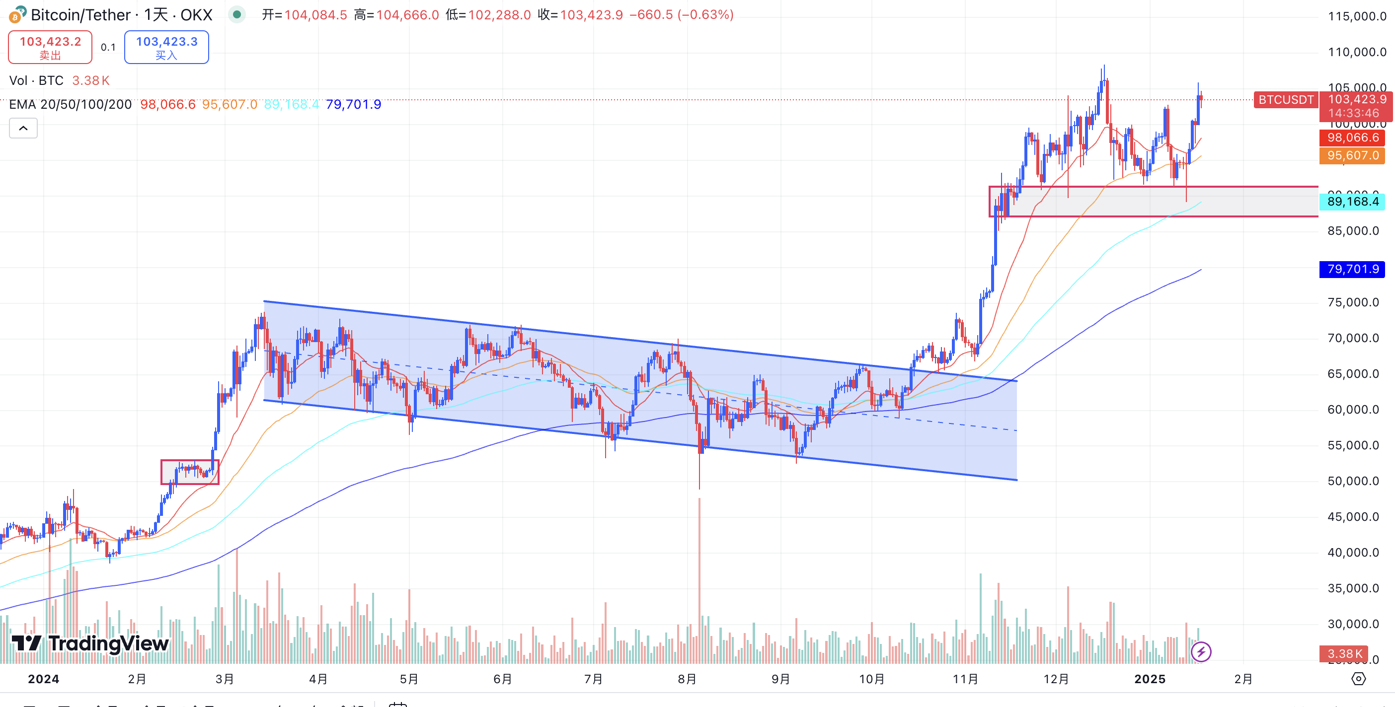 当 Trump 当选前夕,BTC 再次冲高,但是在前高 73700 美元附近停下脚步,并没有冲破前高,在资金避险的状况下进行震荡调整,下杀至 66000 美元附近。而后又随着红蓝两党在美国本土的交相辉映中,确认了 Trump 当选美国总统,BTC 再次放量拉升,突破前高 73700 美元附近,独立美股走出了一段大牛行情,涨幅接近 50%,上冲至最高 108000 美元附近。