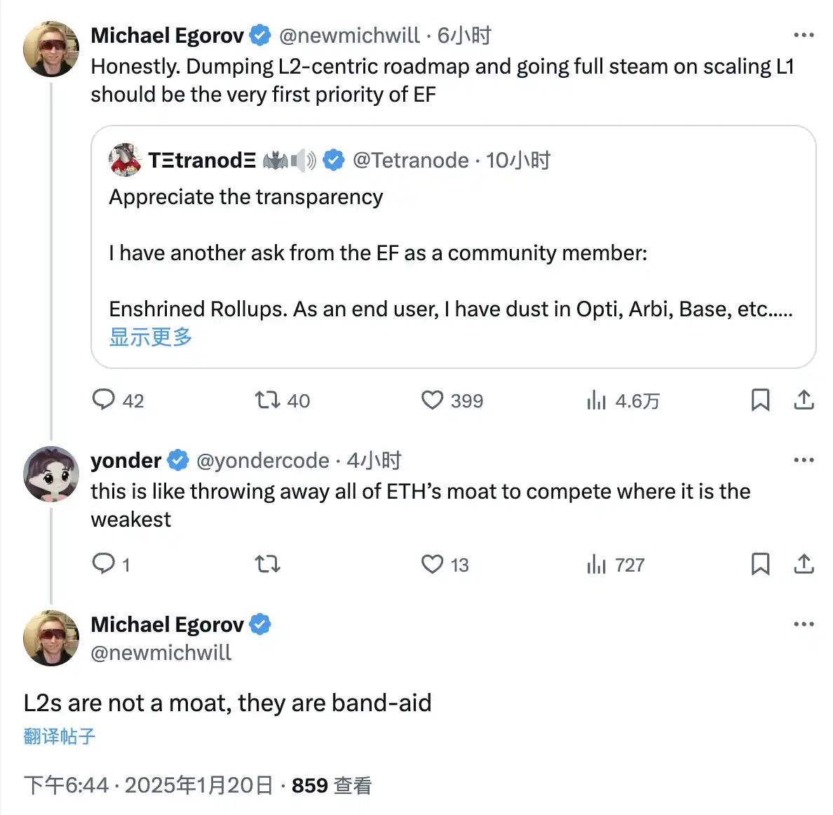 在之后和社区成员的讨论中,Egorov 还直言:「Layer 2 不是护城河,而是创可贴。」