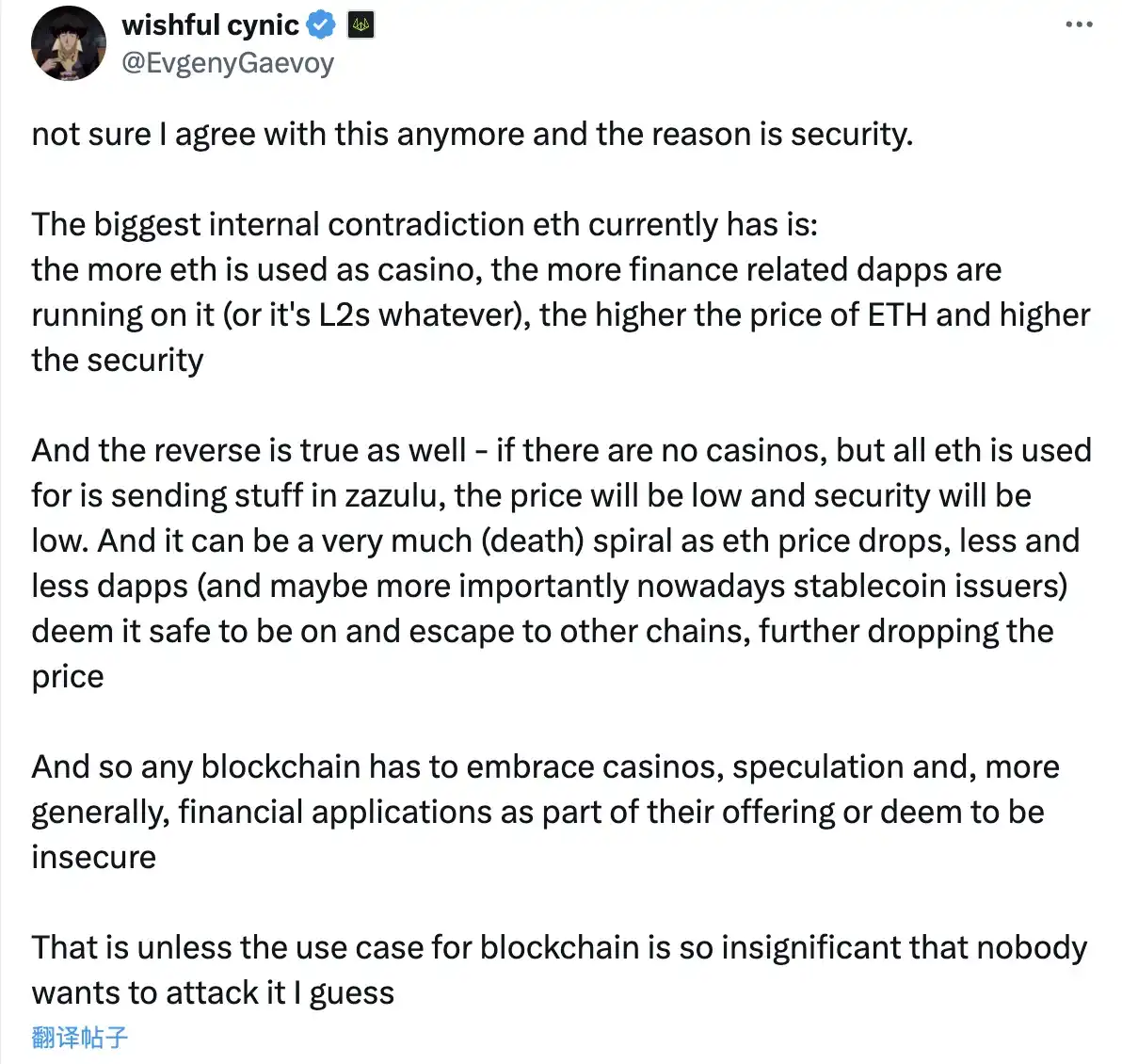 Evgeny 表示,以太坊目前最大的内部矛盾是:越多的 ETH 被用作「赌博」,越多与金融相关的 Dapp 在以太坊之上运行,ETH 的价格就越高,安全性就越高;反过来,如果没有赌博行为,ETH 只被用作在 Zazulu 转账,那么 ETH 的价格就会很低,安全性也会很低。随着 ETH 价格的下降,认为以太坊依旧安全的 Dapp 也会越来越少并逃到其他链上,从而进一步降低 ETH 价格,这可能是一个非常大的死亡螺旋。