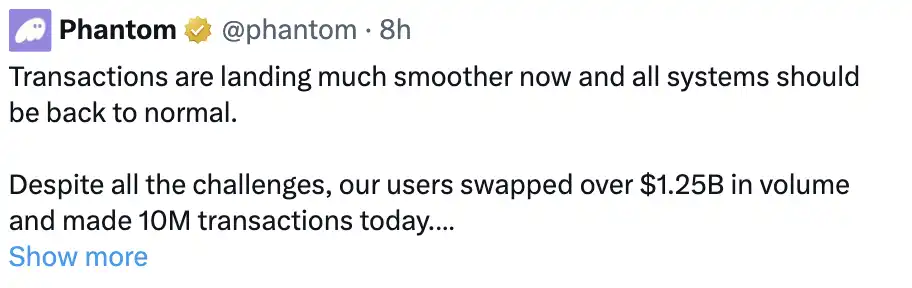 @phantom:「交易现在已经恢复顺畅,所有系统运行正常。