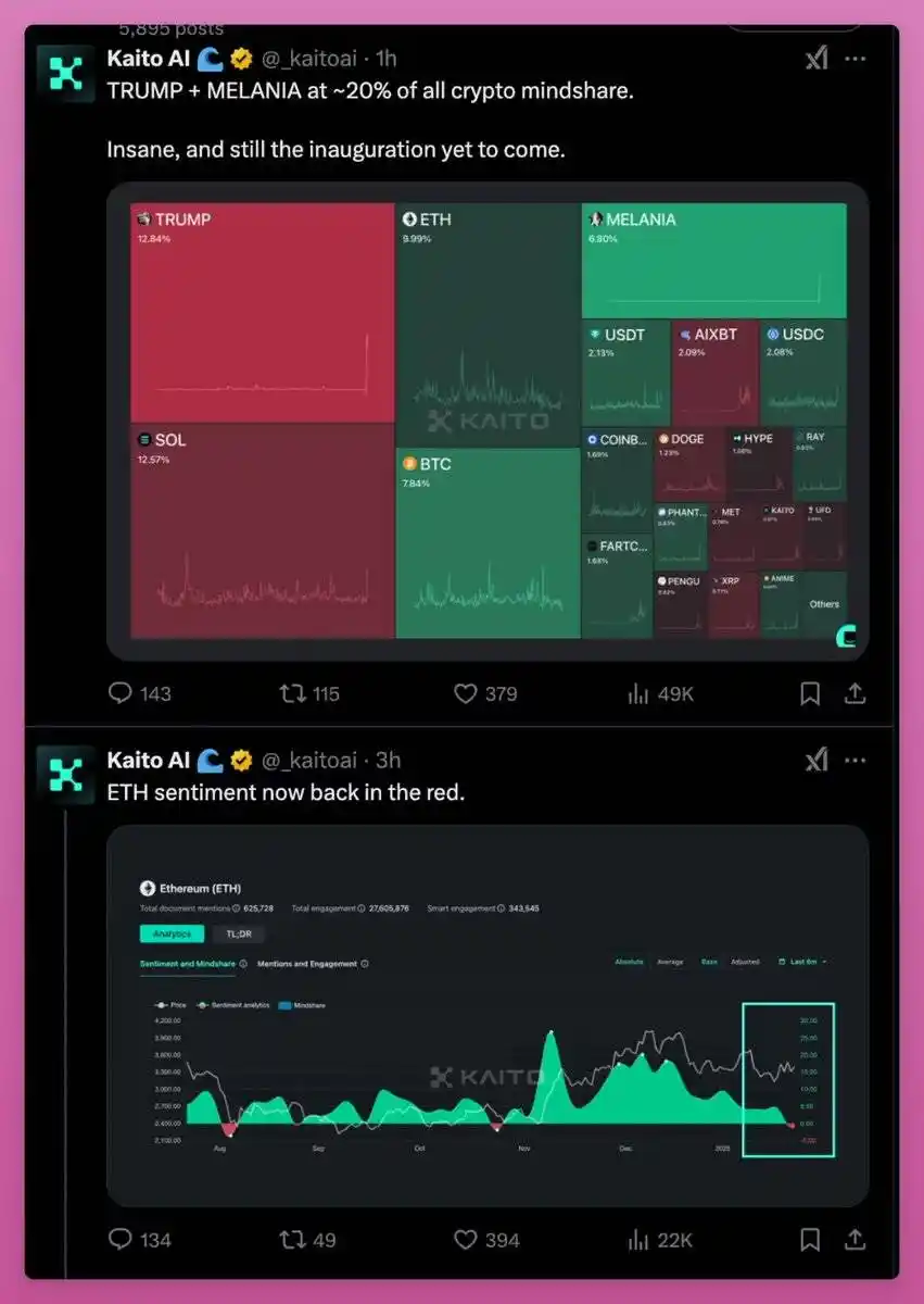 这一周末毫无疑问是属于 Solana 的:$TRUMP、MELANIA 和 $SOL 占据了市场的主要关注点。而与此同时,ETH 的市场情绪再次转为负面。