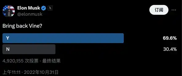 2022 年 10 月 31 日,马斯克在推特发起民意调查,询问是否恢复推特旗下短视频应用 Vine。结果显示, 69.6% 参与投票的用户支持恢复 Vine。投票结果公布后,马斯克随即在 2022 年 11 月 1 日指示推特工程师团队重新启动短视频应用 Vine,并宣布在当年年底前准备就绪,但此后不了了之。