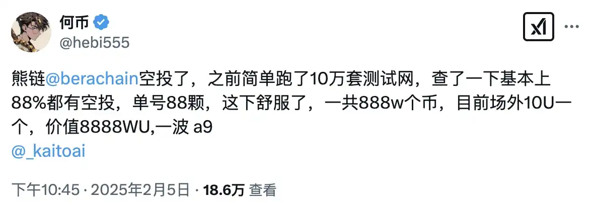 根据这位受访者陈述,许多「撸毛工作室」在 Berachain 测试网交互中出现了「团灭」现象,参与不少测试网交互,但最终获得代币没有持有 BNB 给的代币份额多。因此,大家会看到不少「撸毛大户」在 X 平台上发文调侃自己「赚麻了」来表示对项目空投规则的不满。