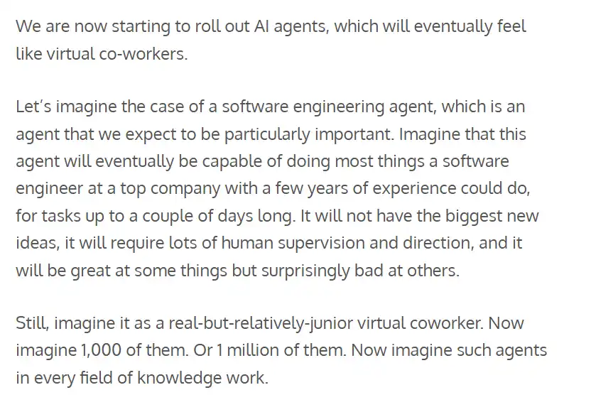 文中还特意强调,OpenAI 正在全力布局 AI Agent,这些成千上万的智能体最终会被广泛使用,成为各种业务场景中的虚拟同事。初级 Agent 的性能可能会差一些,但他们仍然会渗透到各个领域重塑世界经济。