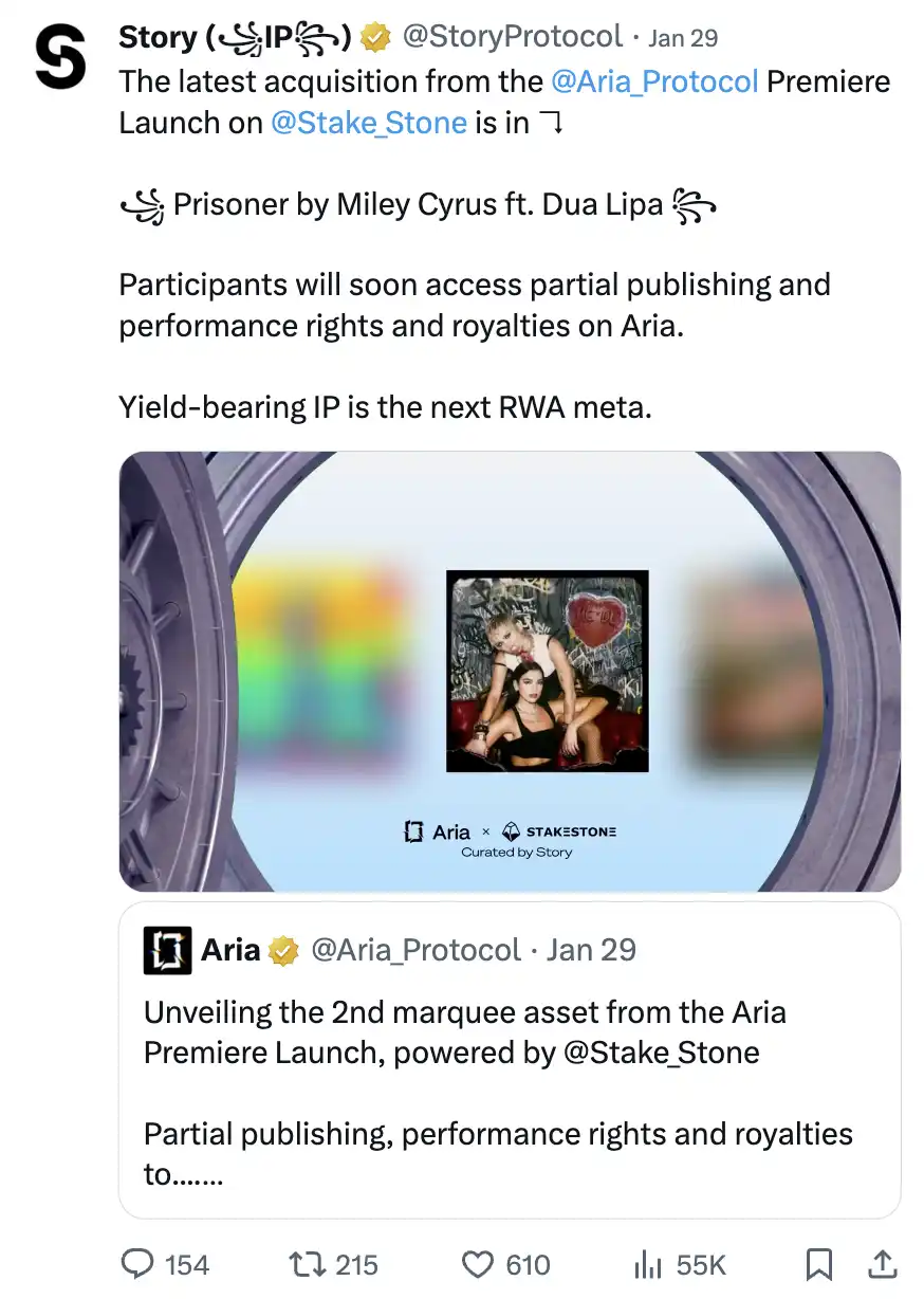 目前,Aria 已代币化了两项 IP,其中包括 Miley Cyrus & Dua Lipa 的《Prisoner》。
