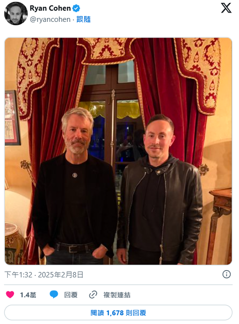 在经历史诗般的涨幅后,GameStop 价格近几年持续下滑,去年四月最低逼近 10 美元一股。值得注意的是,GameStop 执行长 Ryan Cohen 在 8 日发推附上与 Strategy(原微策略)创办人 Michael Saylor 的合照。