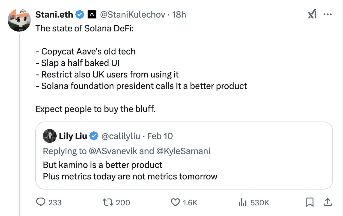 Aave 创始人 Stani 直接开火,说 Solana DeFi 的现状是抄袭 Aave 的旧技术,粘贴一个半成品的 UI,还限制英国用户使用。尽管 Stani 说的是 Solana DeFi,但明眼人知道他针对的是同为借贷协议的 Kamino。