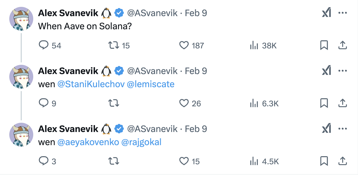 昨日,Virtuals Protocol 宣布 VIRTUAL 代币现在可以于 Solana 链上交易,其官方 LP 现已在 Meteora 上线,并已为 Virtual Protocol 在 Solana 链上的 Launchpad 做准备。与此同时,Nansen CEO Alex Svanevik 在推特上表示 Aave 什么时候能在 Solana 上使用,并随之艾特了 Aave 的团队成员以及 Solana 创始人等。