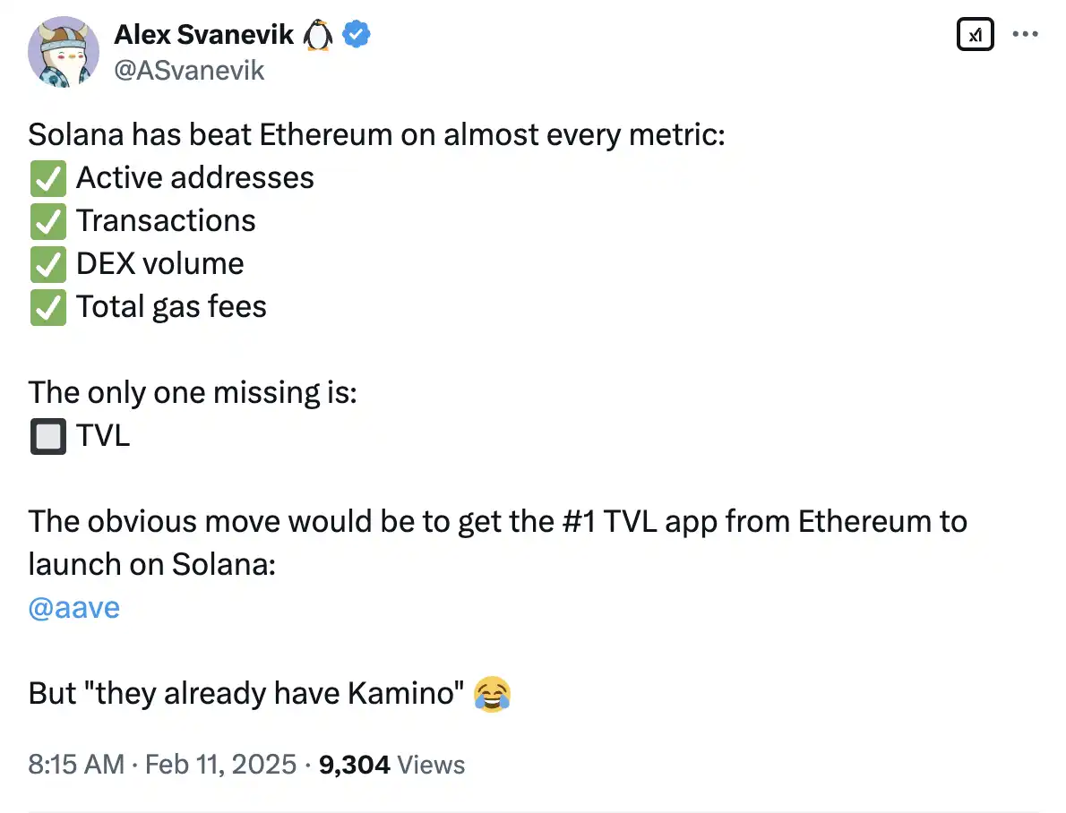 而引发这场「口水战」的正主 Alex Svanevik 此时又来添了一把火,他表示 Solana 在多个关键指标上已超越以太坊,包括活跃地址数、交易量、DEX 交易量以及总 Gas 费收入。然而,在 TVL 方面,Solana 仍未能超越以太坊。鉴于此,最直接的策略是吸引以太坊上 TVL 排名第一的应用 Aave 在 Solana 上部署,从而进一步提升其 DeFi 生态的竞争力。