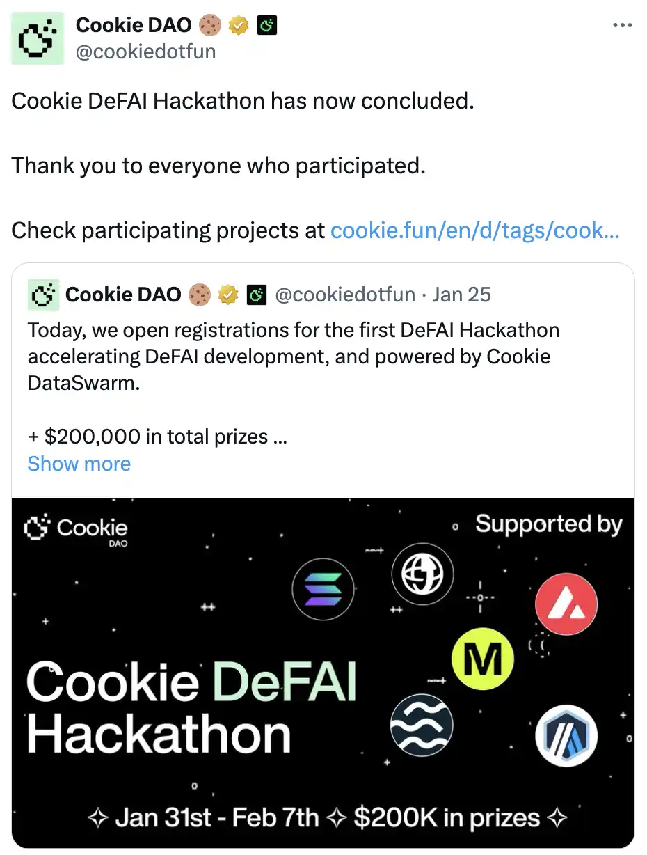 Cookie DeFAI 黑客松落幕,决赛评审正在进行中。