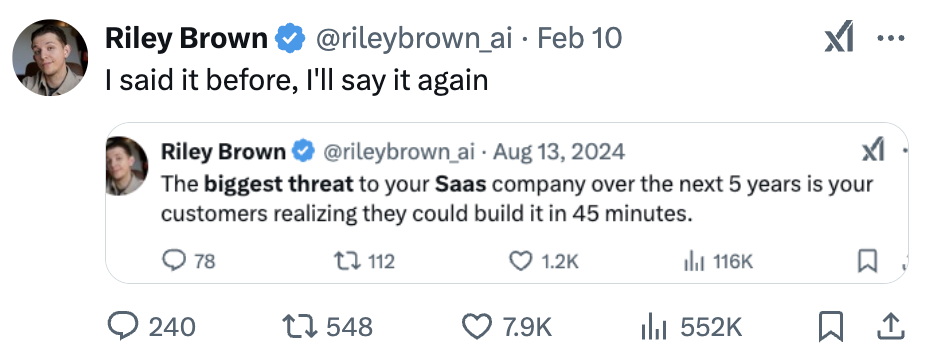 「未来五年你 SaaS 公司的最大威胁,是你的客户意识到他们可以在 45 分钟内自己搭建出来。」——@rileybrown_ai